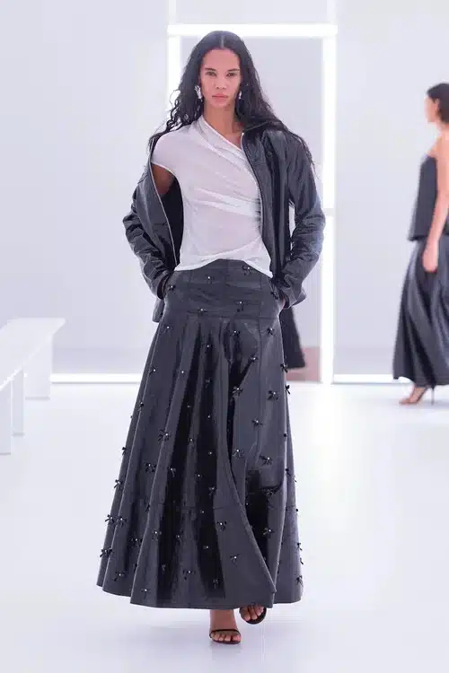 For Brandon Maxwell SS24 Ready-to-Wear, NYES laser cut leather into delicate bow shapes, which were then meticulously hand-applied with silver studs. This intricate embellishment process added texture, depth, and a striking visual contrast, enhancing the elegance of the design while ensuring a seamless fusion of craftsmanship and innovation.