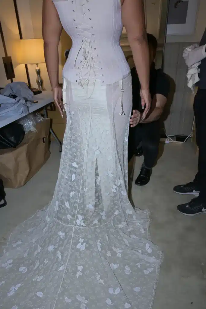 Each lace appliqué was carefully hand-sewn onto the skirt, ensuring a precise and seamless integration with the fabric. This meticulous process required patience and expertise to maintain the garment’s delicate structure while adding intricate detailing. The result was a beautifully textured design that elevated the overall look, showcasing the artistry and craftsmanship of NYES.