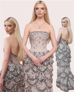 Anya Taylor-Joy wowed the red carpet in this Christian Dior Haute Couture gown. Inspired by Botticelli’s “Birth of Venus,” an Italian painting from the 1400s, the skirt was designed with layers of blinged-out petals and feathers.